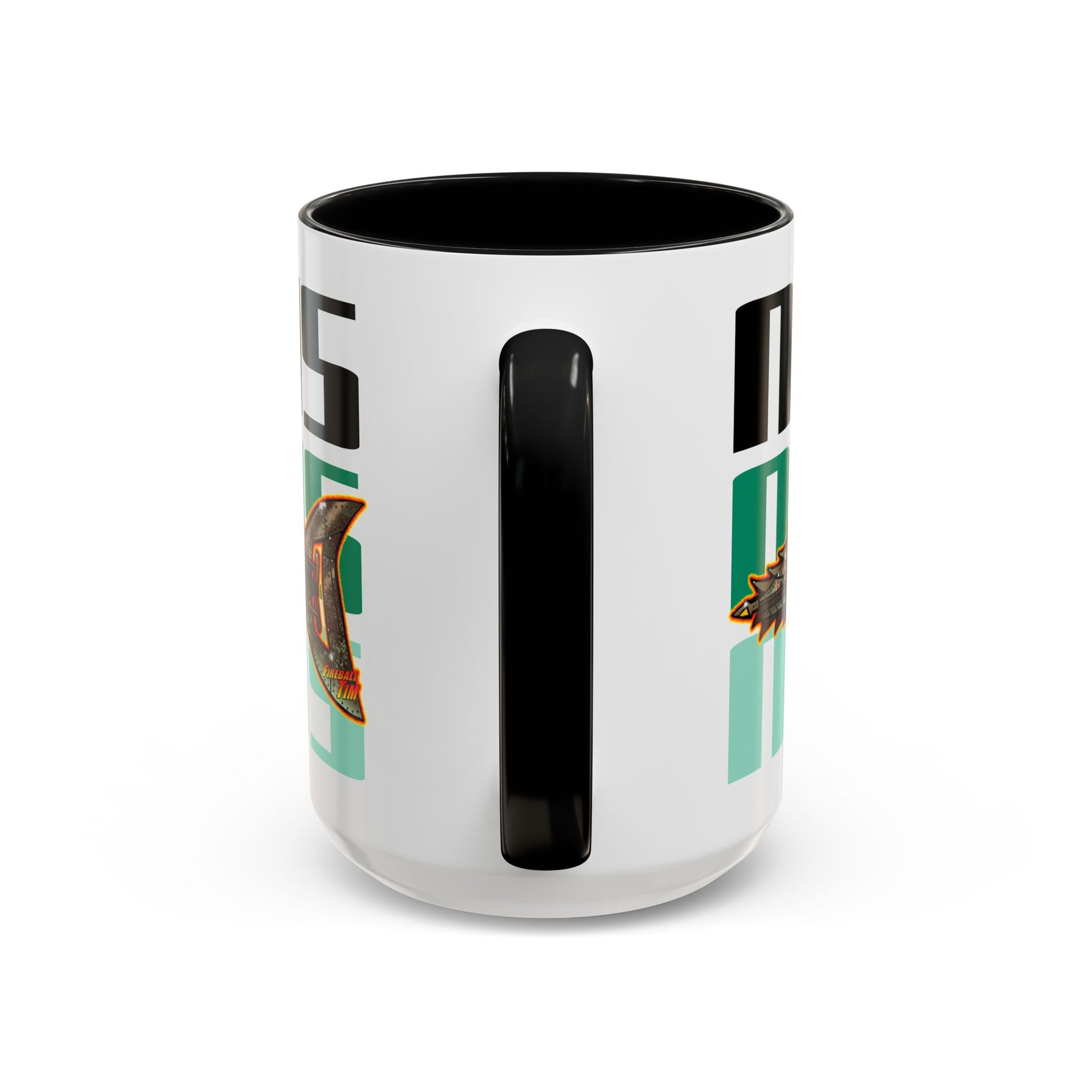 This glossy ceramic mug brings a touch of playful retro-sci‑fi to everyday coffee and tea moments. The bold, blocky lettering wraps around the cup with a teal striped backdrop while a detailed, weathered starship illustration glides across the surface — a little bit nostalgic, a little bit adventurous. The colored interior and handle add contrast that makes the artwork pop. Whether used for a morning brew during planning sessions or for a quiet late-night desk companion while sketching ideas, this mug feels like a small, intentional piece of personality for someone who appreciates quirky, illustrated design and strong visual statements.